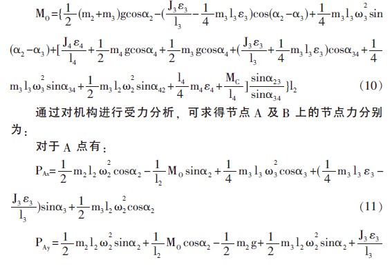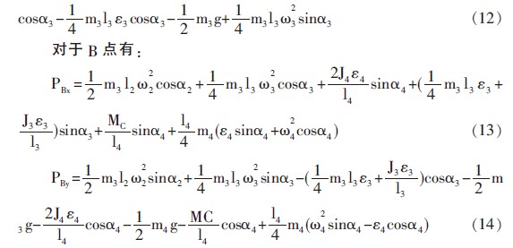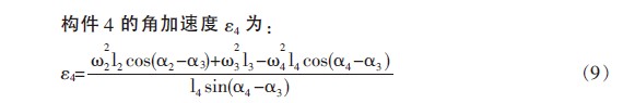 在圖1 所示的機(jī)構(gòu)中,設(shè)主動(dòng)件2 的輸入?yún)?shù)為α2;從動(dòng)件4 的 輸出參數(shù)為α4;各桿長度為:li(i=1,2,3,4),MO 和MC 分別為輸入力矩和 輸出力矩;mi 和Ji 分別為各桿件的質(zhì)量和繞通過桿件質(zhì)心軸線的轉(zhuǎn)動(dòng) 慣量;ω2 為常量。 由虛位移原理, 可求得在輸出力矩MC 不變的情況下的輸入力矩 MO,即: