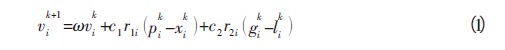 粒子群算法是一種群體智能算法。該算法的基本思想源于鳥類群體飛行覓食的行為。PSO算法通過個體之間的協(xié)作與競爭,實現(xiàn)復雜空間中最優(yōu)解的搜索。而且PSO算法效率較高,也易于實現(xiàn),在工程實踐中應用范圍也越來越廣泛。PSO算法的基本過程包括:初始化、粒子飛行和結果確定。算法首先隨機生成初始種群,其中包含若干數(shù)量的粒子,這些粒子將在可行域內運動。通過計算每一個粒子的適應值,從而獲得粒子新的運動方向和運動速度。一般情況下,在粒子每一輪運動過程中,最優(yōu)粒子以及歷史最優(yōu)粒子對粒子下一輪運動有較大的影響。最后,經過多次迭代計算之后,獲得最優(yōu)解。Shi和Eberhart 在早期PSO算法基礎上通過引入慣性權重,較好地改善了PSO算法的收斂性能,其粒子的進化方程為: