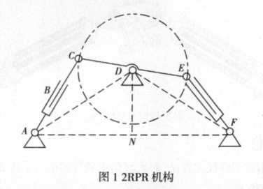 項目對鉸鏈的要求是:載重量3t、輸出轉角為±90°,尺寸不 超過(2000×500×1000)mm。根據(jù)上述要求,選擇2rpr機構作為鉸鏈機構,如圖1 所示。機構的主要特點是: