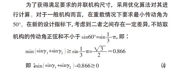 在前述設計要求中,轉角范圍、尺寸要求等均可以通過幾何 約束來實現(xiàn)。對于載重量的要求,一個關鍵就是要求機構具有良好的力傳遞能力。