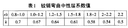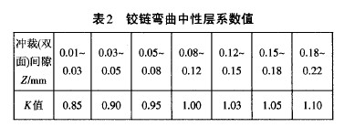 式中: △a——彎曲角回彈量;a ——彎曲件的彎曲角 度;r 彎曲件的彎曲半徑; r凸——彎曲凸模半徑。 從公式(2)可以看出,當 r一定時, △a受到a和r凸 的影響。a 越小,△a越大; a 越大,△a越小。而第1次 預彎工步的彎曲角△a已確定,且較小,只有26°,那么 只有減小r凸,以控制△a。而r 減小,勢必影響鉸鏈內(nèi)孔圓度,從而影響鉸鏈質(zhì)量。另外,同彈計算還 可按公式 :