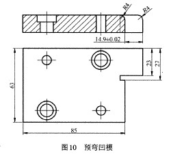 (2)預彎凹模設計。考慮到凹模剛性,2個工步 的預彎凹模設計成一個整體,如圖10所示。預彎凹 模是鑲于沖孔凹模上,關鍵尺寸是(14.9+0.02)mm, 它應同時保證2個工步預彎間隙。