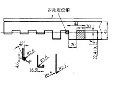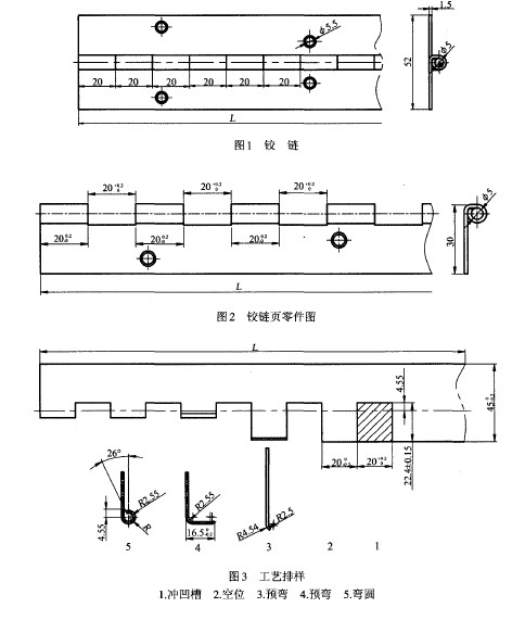 鉸鏈結構特點:長度從400-1600mm不等,鉸鏈頁材料按現(xiàn)場邊角料分有2種:不銹鋼和低碳鋼。鉸鏈軸是φ5 mm的冷拉不銹鋼,鉸鏈頁上的安裝孔φ5 mm的位置根據(jù)配電柜的需要配做。鉸鏈頁工藝是鉸鏈的核心。圖2是鉸鏈頁的零件圖,鉸 鏈由2個鉸鏈頁組成,2個鉸鏈頁結構在組合處的凸凹部分在長度方向相差20mm 其他完全一致。因此可在鉸鏈頁加工完成后裁剪一節(jié)20 mm即可,或 在模具上設置活動定位裝置。