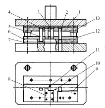 鉸鏈彎形模具有許多種,實踐應用也較普遍。但多適應于短型的鉸鏈,而對于長型鉸鏈彎形模具很少見到。圖7是設計的鉸鏈級進模結構(排 樣圖已放大),圖8(a)、(b)、(c)分別是第1次預彎、 第2次預彎和彎圓的凸、凹模與板料接觸狀態(tài)圖。 因工件有3個工步的彎曲特征,導料卸料板B的長度設計成全程導料,而導料卸料板A的長度設計成 非全程導料、卸料,同時可以避位。因此,該模具 導料卸料板A設計長度為50 mm;安裝到模具的入 料口(見圖7中的件9)。模具適用于普通壓力機;人 工送料或機械化自動送料。鉸鏈頁內(nèi)孔尺寸精度 是工件的關鍵尺寸,是模具設計的核心。