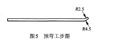 (2)預彎凸模3和預彎凸模4。預彎凸模3和預 彎凸模4設計時,圓角半徑 是關鍵,預彎凸模3的 圓角半徑,按2.5 mm設計;預彎凸模4的圓角半徑r 按2.55mm設計。其目的是保證內(nèi)孔圓度。