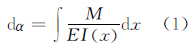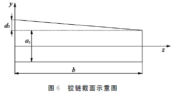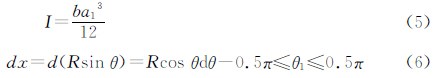 式中,α 是轉(zhuǎn)角;M 是轉(zhuǎn)矩;E 是材料彈性模量;I 是鉸鏈截面對z 軸的慣性矩。取出如圖2的微元進(jìn)行積分,可得鉸鏈轉(zhuǎn)角公式為: