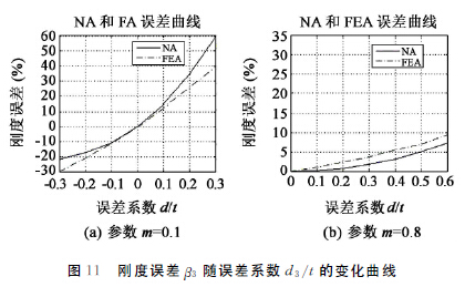 鉸鏈參數(shù)m 對剛度誤差β3也不敏感,但誤差參數(shù)d3/t的影響較大,如圖11所示,?。恚剑埃保?dāng)d3/t=0.3時(shí),NA 的誤差是59.11%,FEA 的誤差是41.44%;當(dāng)d3/t= -0.3 時(shí),NA 的誤差是-21.53%,FEA的誤差是-27.63%。同時(shí)注意到,在數(shù)值計(jì)算時(shí),假設(shè)圖6所示鉸鏈截面兩端的轉(zhuǎn)角是一致的,而實(shí)際上當(dāng)施加一定載荷時(shí),截面兩端的轉(zhuǎn)角并不一致而具有一定的扭轉(zhuǎn),這也造成了NA 和FEA計(jì)算結(jié)果的偏差。