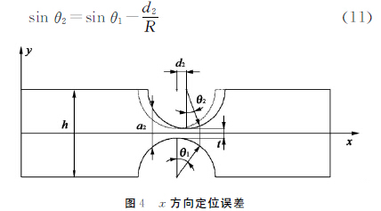 理想鉸鏈的上下切口圓弧是嚴(yán)格對稱的,采用鉆孔或者電火花切割加工時(shí),切口圓弧中心x 方向定位誤差d2如圖4所示,由圖可知