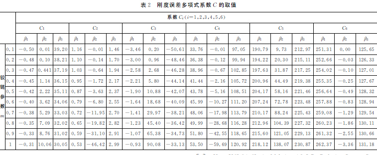合式(8)可求得剛度誤差β2。對p=(0,0.3)范圍內(nèi)的誤差β2進(jìn)行數(shù)值積分和多項(xiàng)式擬合,得到鉸鏈不同m 參數(shù)下誤差系數(shù)p 造成的剛度誤差為