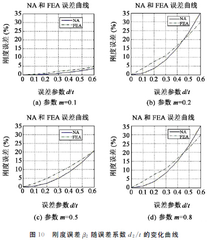 結(jié)合計(jì)算結(jié)果和圖9可知,NA 和FEA 的誤差曲線較為吻合,鉸鏈參數(shù)m 對誤差β1幾乎沒有影響,但是誤差系數(shù)d1/t對剛度的影響較大,?。恚剑埃保?/font>當(dāng)誤差系數(shù)d1/t為0.3時(shí),NA和FEA的剛度誤差分別可達(dá)93.44%和82.5%。