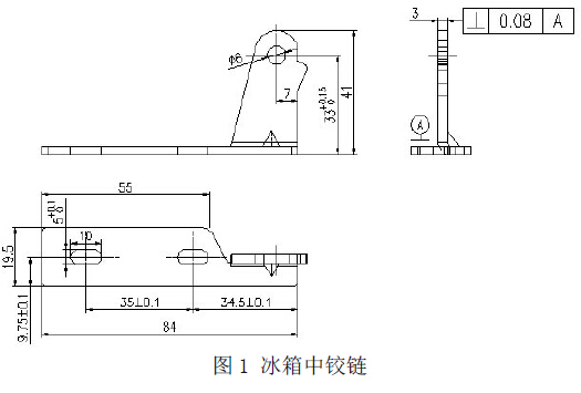 如圖1所示零件,是某型冰箱的配件——中鉸鏈。材料為厚度3mm的Q235,年產(chǎn)量150萬件。要求加工后邊緣不得有尖銳毛刺、利邊;表面平整,凹凸不能大于0.2mm。此零件安裝在冰箱前中部,直接連接冰箱上門和下門,起著“承上啟下”的作用,既要承受冰箱上門以及門中承載物的重量,又要固定下門,受力比較大,同時又要保證門體開和關(guān)的靈活性,所以在零件制造過程,要求不能減薄零件的板料厚度,又要保證其垂直度。此零件按傳統(tǒng)的加工工藝常采用一模沖一件的方式加工。