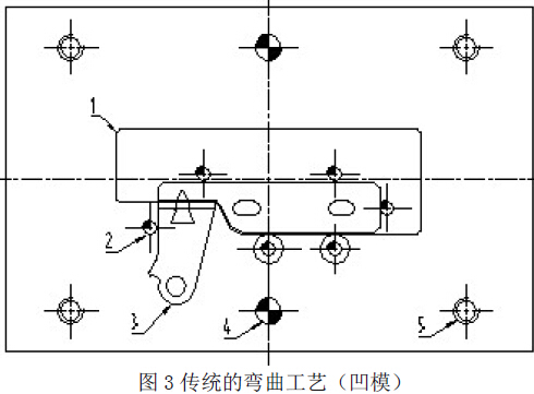 1. 成形凹???;2. 六處定位銷;3. 展開后的零件;4. 凹模固定銷孔;5. 凹模固定螺孔