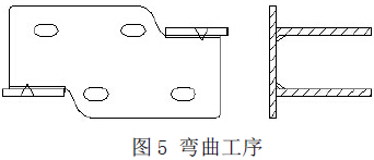 3)由于在傳統(tǒng)的工藝中,彎曲工序不能保證零件的垂直度,往往需要增加一道整形工序,這樣增加了產(chǎn)品的生產(chǎn)成本,同時由于零件較小,整形時不容易定位,由于操作原因經(jīng)常出現(xiàn)產(chǎn)品的報(bào)廢現(xiàn)象;