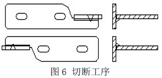 根據(jù)對傳統(tǒng)工藝中出現(xiàn)的問題進(jìn)行分析,利用所學(xué)的文化知識和積累的工作實(shí)踐經(jīng)驗(yàn),結(jié)合我們學(xué)校現(xiàn)有的條件,制定出新的加工工藝:落料沖孔——彎曲——分離(如圖4、5、6.)。該工藝采用1模沖2件的生產(chǎn)方式。