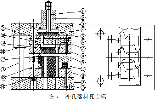 1. 打料桿;2. 模柄;3. 上模座;4. 打料塊;5. 墊板;6. 沖孔凸模;7. 固定板;8. 凹模;9. 下卸料板;10. 彈力膠;11. 凸模固定板;12. 固定螺絲;13. 下模座;14. 落料凸模;15. 卸料螺絲;16. 導(dǎo)柱;17. 彈性定位釘;18. 導(dǎo)套;19. 上卸料塊;20. 打料釘;21 固定螺絲和銷釘