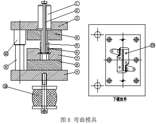 2)彎曲工序中采用一彎二的結(jié)構(gòu),(如圖8)旋轉(zhuǎn)排料,借用已經(jīng)沖好的中間四處U形孔定位,無需壓料板,當(dāng)凸模下行時,零件沿著凹模的模框內(nèi)壁成形,凸模的外壁與凹模??騼?nèi)壁間隙控制零件的平整度,下卸料板在凸模的壓力下克服彈力膠的彈力,往凹模深處移動,當(dāng)移動到下限時,在凸模的壓力作用下,對產(chǎn)品起著整形壓平作用,保證零件的垂直度和底面的平整。完成彎曲和壓形后,凸模向上移動,下卸料板在下彈力裝置的反彈力下恢復(fù)原位置,彈出零件,如果零件附在凸模上,當(dāng)凸模移動到上限時,壓力機(jī)的上打料裝置推動打料桿,彈出零件。由于1模沖2件,增大了凸模底面與零件有效接觸面積,同時利用中間4孔定位。在沖壓過程中,下卸料板受力比較均衡,沒有產(chǎn)生傾斜現(xiàn)象。這樣利用力均衡的方法解決了彎邊不垂直;移位,退料不暢等現(xiàn)象。