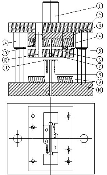 1. 模柄;2. 上模座;3. 上墊板;4. 上固定板;5. 彈力膠;6. 壓料板;7. 凸模;8. 凹模;9. 凹模固定板;10 下模座;11. 產(chǎn)品;12 小導(dǎo)柱;13. 小導(dǎo)套;14 模架導(dǎo)柱導(dǎo)套