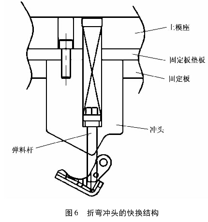 模具在工作過程中會使部分零部件磨損較嚴(yán)重,如二序成形模中的折彎沖頭(圖6),在模具設(shè)計(jì)時(shí),通常將其原來的掛臺固定方式改換成螺紋固定,使后期在不拆卸模板的情況下實(shí)現(xiàn)沖頭的拆卸和更換。此外,由于前門兩側(cè)的鉸鏈車身件具有對稱結(jié)構(gòu),在落料模具設(shè)計(jì)時(shí)凸凹模設(shè)計(jì)成易更換的鑲塊結(jié)構(gòu),在增加耐用性、易換性的同時(shí),可以通過更換相應(yīng)的凸凹模鑲塊加工左右門鉸鏈的車身件,使左右對稱的鉸鏈車身件共用一套落料模具,從而減少了模具開發(fā)成本及模具加工過程中的能耗,節(jié)約了模具材料資源。