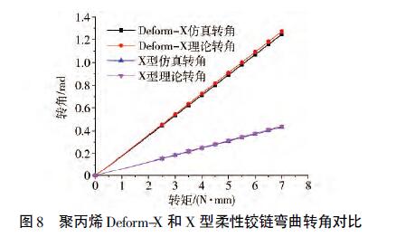 根據(jù)計(jì)算得到的數(shù)據(jù)可以繪制出Deform-X柔性鉸鏈和X型柔性鉸鏈彎曲轉(zhuǎn)角對(duì)比變化趨勢(shì)如圖7所示,同理可以得到鉸鏈材料為聚丙烯時(shí)Deform-X柔性鉸鏈和X型柔性鉸鏈彎曲仿真轉(zhuǎn)角對(duì)比變化趨勢(shì)如圖8所示。從圖中可以看出,相同材料和外形尺寸的Deform-X柔性鉸鏈和X型柔性鉸鏈的彎曲性能差異很大,在相同轉(zhuǎn)矩作用下,Deform-X柔性鉸鏈的彎曲變形轉(zhuǎn)角約為X型柔性鉸鏈的3倍,即Deform-X柔性鉸鏈可以在較小的轉(zhuǎn)矩作用下產(chǎn)生較大的彎曲變形,其彎曲性能得到很大提升。