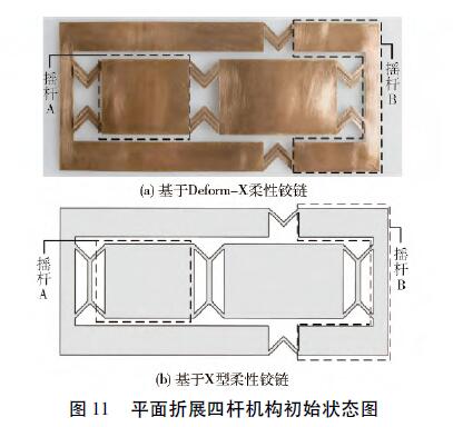 (4)設(shè)計(jì)了基于Deform-X柔性鉸鏈的平面折展四桿機(jī)構(gòu)的實(shí)物模型,通過(guò)實(shí)物測(cè)試和仿真分析表明Deform-X柔性鉸鏈能夠?qū)崿F(xiàn)預(yù)期的變形,機(jī)構(gòu)能夠?qū)崿F(xiàn)預(yù)期的運(yùn)動(dòng)。