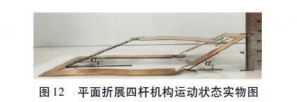 設(shè)計(jì)基于Deform-X柔性鉸鏈實(shí)例的平面折展四桿機(jī)構(gòu),材料為鈹青銅,采用線(xiàn)切割加工,該機(jī)構(gòu)實(shí)物初始狀態(tài)如圖11a所示,機(jī)構(gòu)展開(kāi)狀態(tài)如圖12所示。搖桿B末端位移s為37mm時(shí),測(cè)得角度α1為23°、α2為30°。同時(shí),在ABAQUS中建立機(jī)構(gòu)的仿真分析模型如圖13所示,仿真分析得到搖桿B末端位移s為37.87mm時(shí)角度α1為23.17°、α2為30.81°,仿真結(jié)果與實(shí)測(cè)結(jié)果基本一致,說(shuō)明基于Deform-X柔性鉸鏈的四桿機(jī)構(gòu)可以實(shí)現(xiàn)預(yù)期運(yùn)動(dòng)功能。