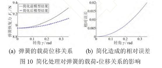 評估式(13)的簡化處理所造成的誤差。根據(jù)零剛度柔性鉸鏈實(shí)際加工參數(shù)(第4.2 節(jié)):n=3,l=40 mm,β=π,ξ=0.2,E=73 GPa;內(nèi)外環(huán)柔性鉸鏈簧片尺寸L=46 mm,T=0.3mm,W=9.4mm;對比式 (12)、(14),簡化前后彈簧的載荷位移關(guān)系和相對誤 差分別如圖10a、10b所示。