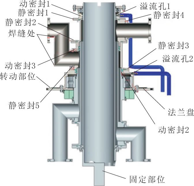 隨著雷達(dá)技術(shù)體制的不斷更新和發(fā)展, 雷達(dá)逐漸向大陣面、大數(shù)據(jù)發(fā)展, 因而對雷達(dá)傳輸功率的要求越來越高, 傳統(tǒng)的風(fēng)冷已滿足不了大型雷達(dá)的冷卻要求, 需采用液冷對雷達(dá)陣面進(jìn)行冷卻?,F(xiàn)代地面雷達(dá)雖然逐漸開始采用相位掃描代替?zhèn)鹘y(tǒng)的機(jī)械掃描工作方式, 但仍有機(jī)械方位轉(zhuǎn)動的要求[1-3]。在雷達(dá)工作過程中, 地面設(shè)備與天線陣面設(shè)備之間冷卻液的轉(zhuǎn)動傳輸就需要靠液體旋轉(zhuǎn)關(guān)節(jié) (又稱水鉸鏈) 來實現(xiàn)[4-5]。水鉸鏈的性能穩(wěn)定與否, 關(guān)系著雷達(dá)冷卻系統(tǒng)的整體性能[6]。因此保證水鉸鏈的壽命和可靠性至關(guān)重要。