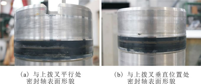c.解剖發(fā)現(xiàn), 離該水鉸鏈與匯流環(huán)連接處最近的動密封1磨損最嚴(yán)重, 離該連接處較遠(yuǎn)的動密封2和動密封3僅有少許磨損 (如圖3所示) , 因此動密封1對應(yīng)的密封軸磨損也最嚴(yán)重 (如圖5所示) 。