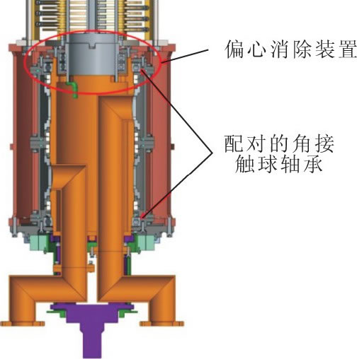a.將水鉸鏈的結(jié)構(gòu)形式由徑向排布式改進(jìn)為軸向排布式, 縮短水鉸鏈的軸向尺寸[5], 從而在保證原外形接口與尺寸不變的情況下, 在水鉸鏈與匯流環(huán)中間增加偏心消除裝置 (如圖8所示) 。