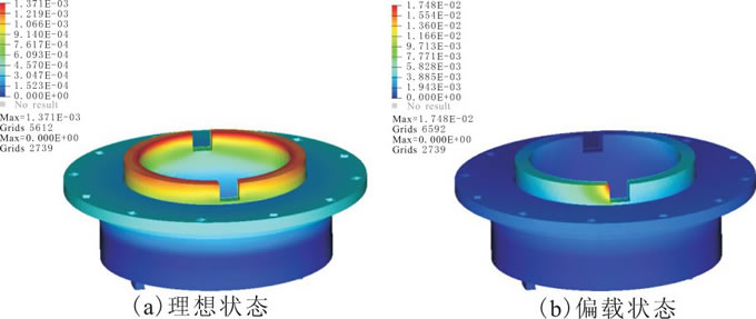 為此, 對水鉸鏈建有限元模型, 分別對其在理想狀態(tài)下 (僅受到匯流環(huán)帶來的100N·m扭矩作用) 與偏載狀態(tài)下 (受到匯流環(huán)帶來的100N·m扭矩和0.4°偏擺角的共同作用) 進(jìn)行力學(xué)仿真分析, 分析結(jié)果如圖6所示。