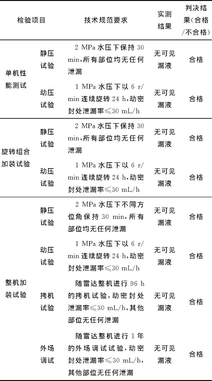 經(jīng)過改進(jìn)后的水鉸鏈已通過單機(jī)性能測試試驗、與匯流環(huán)集成旋轉(zhuǎn)組合后的壓力測試試驗, 以及整機(jī)加裝試驗, 并已隨雷達(dá)整機(jī)進(jìn)行96h拷機(jī)試驗及1年的隨雷達(dá)整機(jī)外場調(diào)試試驗, 試驗情況和試驗結(jié)果如表1所示。結(jié)果表明, 改進(jìn)水鉸鏈各項性能表現(xiàn)良好, 無任何故障出現(xiàn)。