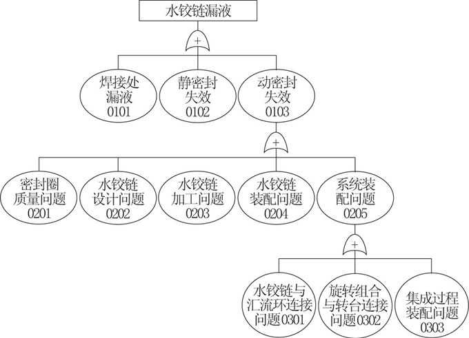 為了對漏液故障準(zhǔn)確定位, 結(jié)合水鉸鏈的內(nèi)部結(jié)構(gòu) (圖1) , 建立故障樹 (圖2) , 并按此逐層分析。