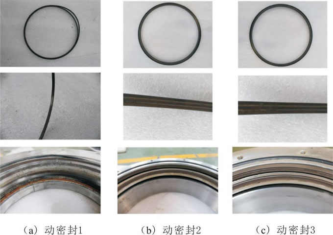 c.解剖發(fā)現(xiàn) (如圖3所示) , 動密封1 (最上端動密封圈) 齒形滑環(huán)的齒形已磨損嚴(yán)重, 其中起補(bǔ)償作用的O型圈已出現(xiàn)不可恢復(fù)的變形, 而動密封2 (最下端動密封圈) 和動密封3 (通道之間的動密封圈) 齒形滑環(huán)的齒形只有少許磨損。