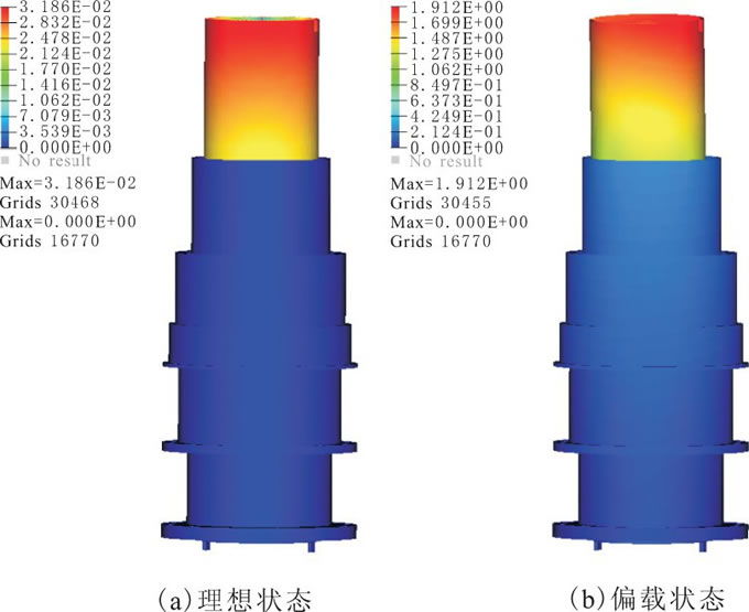 由力學(xué)仿真分析可知, 水鉸鏈在理想狀態(tài)下, 內(nèi)軸上端的最大變形量為0.032 mm;在偏載狀態(tài)下, 離該水鉸鏈與匯流環(huán)內(nèi)軸連接部位越近變形量越大, 并且水鉸鏈內(nèi)軸最頂端與撥叉方向垂直的部位變形量最大, 最大變形量為1.91mm。