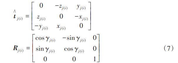 式中:Rj (i)為坐標系{oi}關(guān)于{oj}的方向余弦矩陣,其變量為繞Z坐標軸的旋轉(zhuǎn)角度γj (i);t j (i)為坐標系{oi}關(guān)于{oj}的反對稱移動矩陣,其變量為沿X、Y和Z坐標軸的平動量,即(xj (i),yj(i),zj(i)):