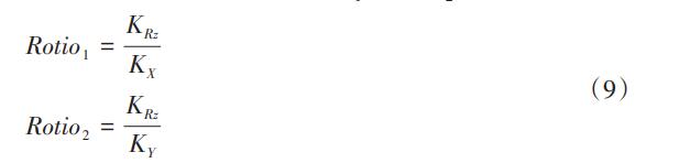 對于半輪型柔性鉸鏈,工作方向為繞Z軸轉(zhuǎn)動的Rz方向,X、Y方向則為非工作方向。施加的載荷主要為繞Z軸的轉(zhuǎn)矩Mz和xOy平面內(nèi)的力,所以半輪柔性鉸鏈發(fā)生的變形和寄生位移均發(fā)生在xOy平面內(nèi),因此本節(jié)只需考慮xOy平面內(nèi)的相對剛度。將剛度矩陣(10)中可得半輪型柔性鉸鏈相對剛度Ratio1、Ratio2為: