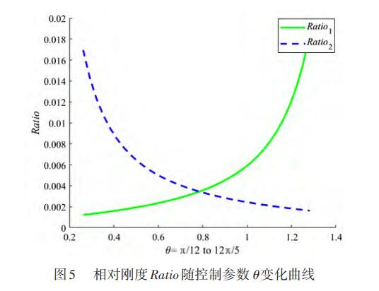 θ對Ratio1、Ratio2的影響如圖5所示。由圖可以看出,Ratio1的值隨θ的增大而增大且在階段變化顯著;相反地,Ratio2的值隨θ的增大而減小且在變化顯著,但兩條變化曲線是非對稱的。且在θ=45°的情況下,Ratio1=Ratio2。
