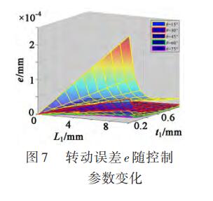 提取半輪型柔性鉸鏈總剛度矩陣(8)中對應(yīng)位置剛度,并代入式(10),得到控制參數(shù)點坐標(L1,t1)與子柔性單元位置狀態(tài)量角度θ對半輪型柔性鉸鏈轉(zhuǎn)動誤差影響如圖7所示。從圖中可以看出,在位置角度θ一定的情況下,變量L1越大,即梁的長度越長,半輪型柔性鉸鏈轉(zhuǎn)動誤差e越大;變量t1越小,即梁的厚度越薄,半輪型柔性鉸鏈轉(zhuǎn)動誤差e越大。軸轉(zhuǎn)動誤差e隨θ的增大而減小,并且在15°~30°變化明顯,在45°~75°變化將不再明顯。