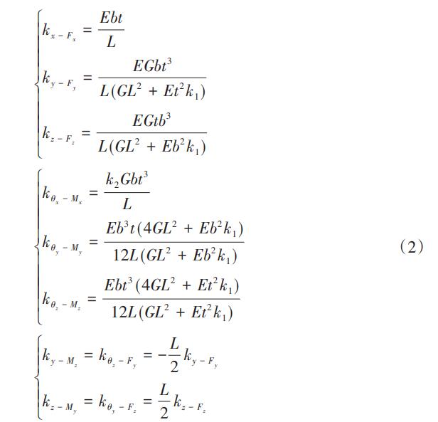 式中:E為楊氏模量;G為剪切模量;k1為剪切修正系數(shù),對于矩形截面k1=6/5;k2為矩形截面自由扭轉(zhuǎn)時的抗扭截面系數(shù)的因數(shù),其取值為“橫截面長/寬”相關(guān)的因數(shù)。